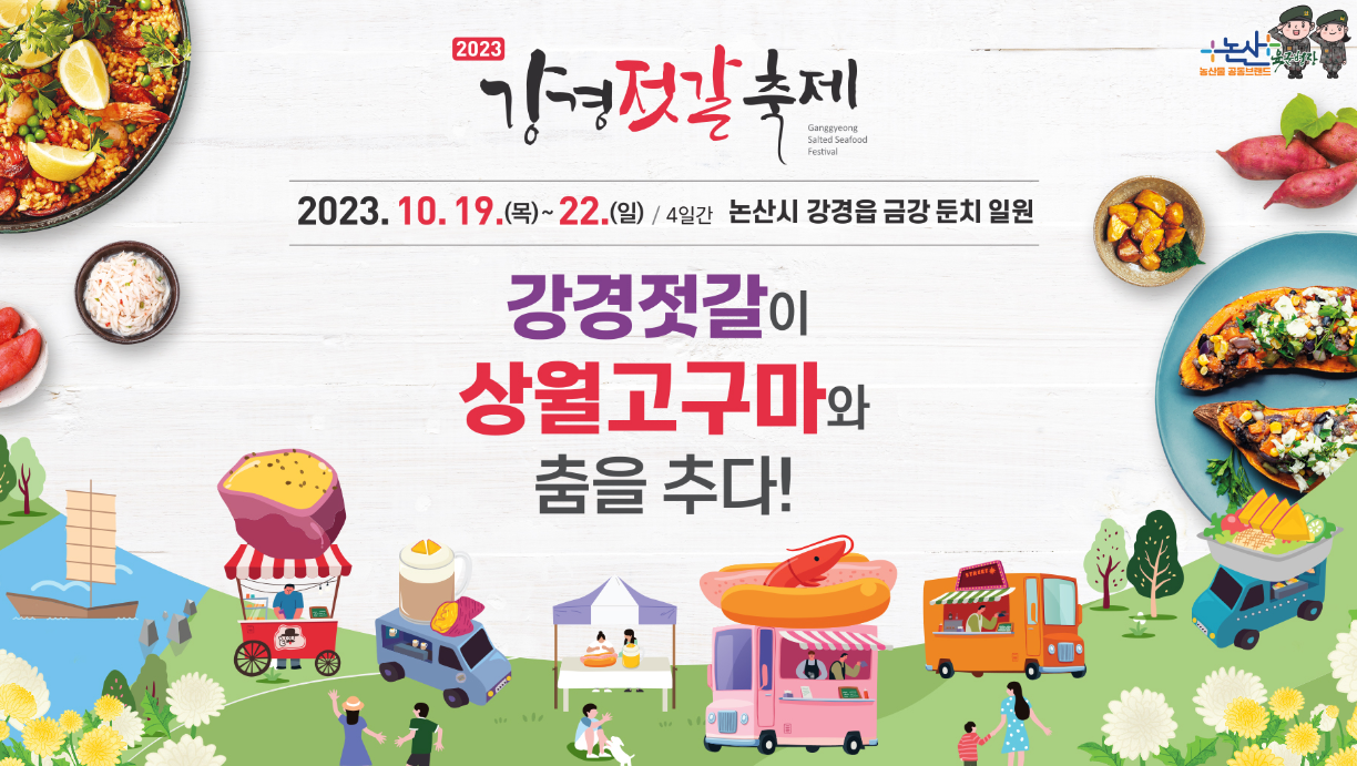 대한민국 젓갈의 대표 지역인 논산 강경에서 강경젓갈축제가 2023년 10월 19일부터 10월 22일까지 4일간 강경읍 금강 둔치에서 진행됩니다.