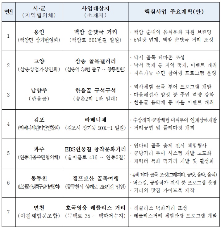 2023년에는 용인 백암순댓국 거리, 고양 삼송 골목갤러리, 남양주 한음골 구석구석, 김포 라베니체, 파주 EBS 연풍길 창작 문화거리, 동두천 캠프보산 월드푸드 스트리트, 연천 백학 호국영웅 레클리스 거리가 신규 대상으로 선정되었습니다.