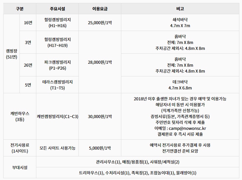 캠핑장 이용을 예약하려면 우선 노원구시설관리공단( 노원구시설관리공단 통합예약시스템 (nowonsc.kr) ) 대관관리시스템에 회원가입한 후에 이용할 수 있습니다.
