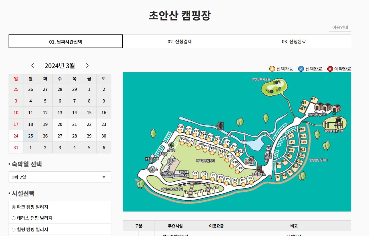 1회 최대 2박 3일까지 예약 신청이 가능하며 주말이나 성수기는 예약 경쟁이 치열하므로 빠른 신청이 필요합니다.