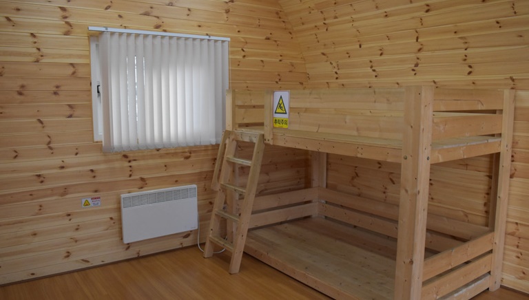 테라스캠핑빌리지는 데크바닥으로 테라스 형식으로 지어져 있고 뷰가 아주 좋으며, 통나무집 형태의 캐빈캠핑빌리지는 직계가족만 신청 가능하며, 나무로 지어지고 내부도 깔끔하게 구성되어 있어 이용이 편리합니다.