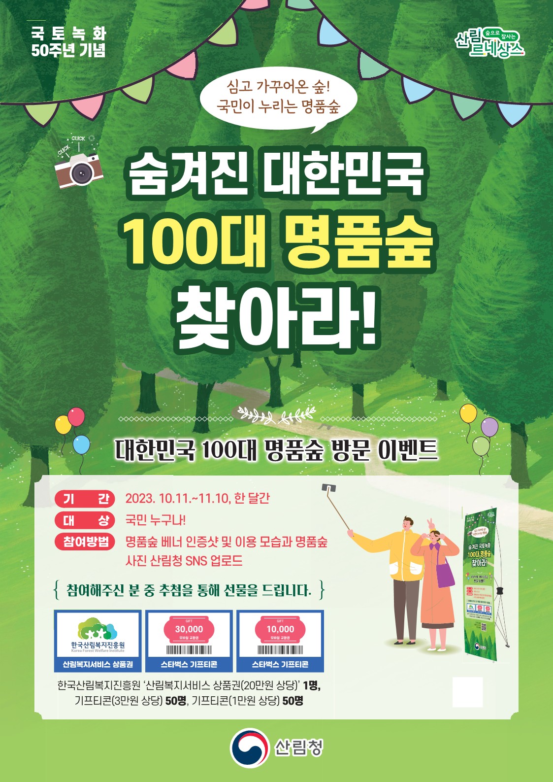 이벤트 참여를 통해 대한민국 100대 명품숲에서 추억을 만들고, 선물도 받아보세요!