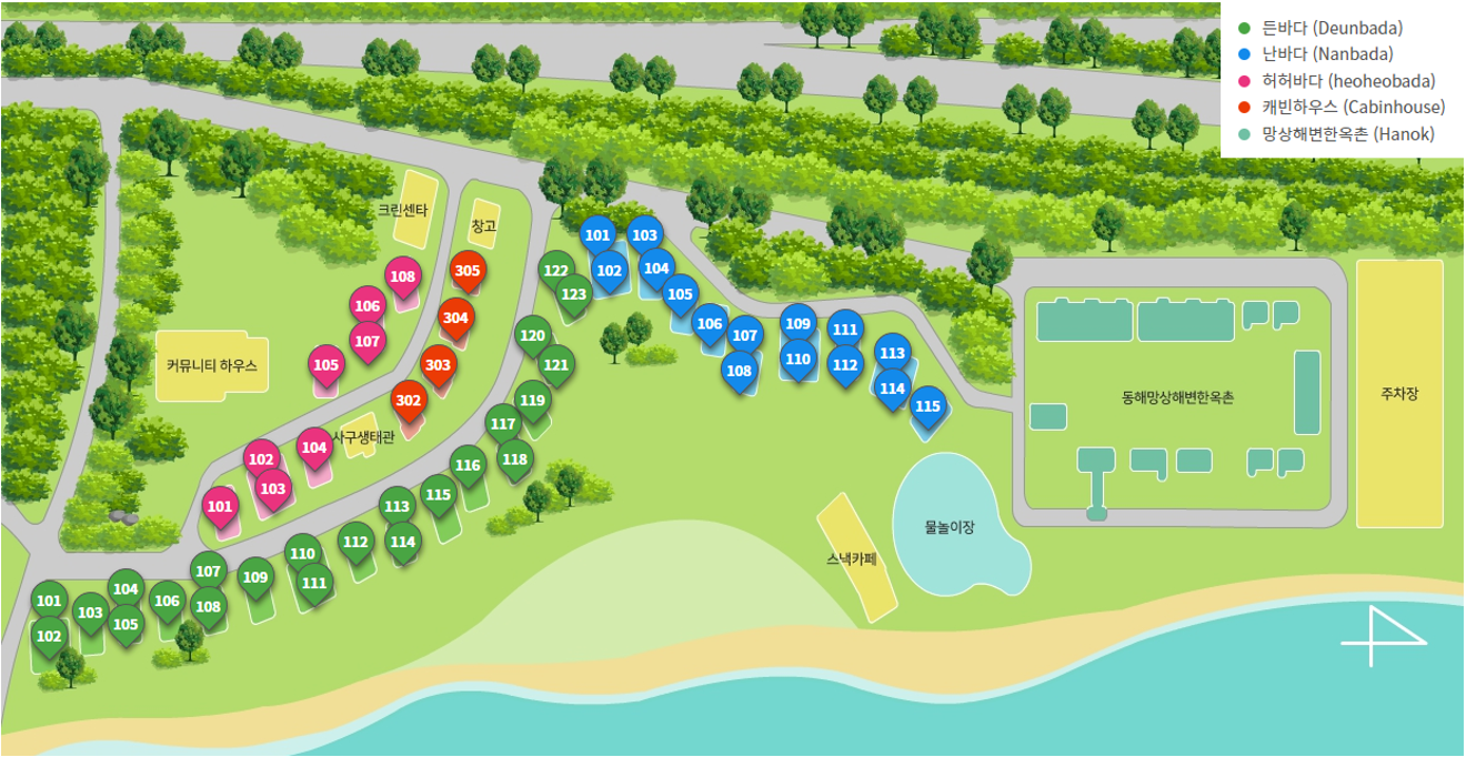 | 26~27번(오토캠핑장) | 조용하고 쾌적하며, 화장실과 적당한 거리에 있습니다 | 바다와는 약간 거리가 있습니다 |