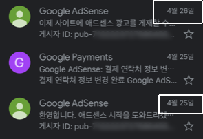 제가 지난 4월 25일 애드센스를 신청하고 다음날인 4월 26일에 승인 안내받은 이메일 캡처입니다.