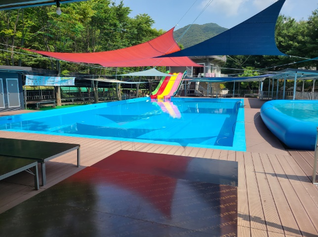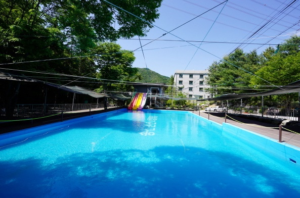 안고령 계곡이 바로 옆에 있어 여름에는 계곡에서 물놀이가 가능하며, 내부 수영장도 갖추고 있습니다.