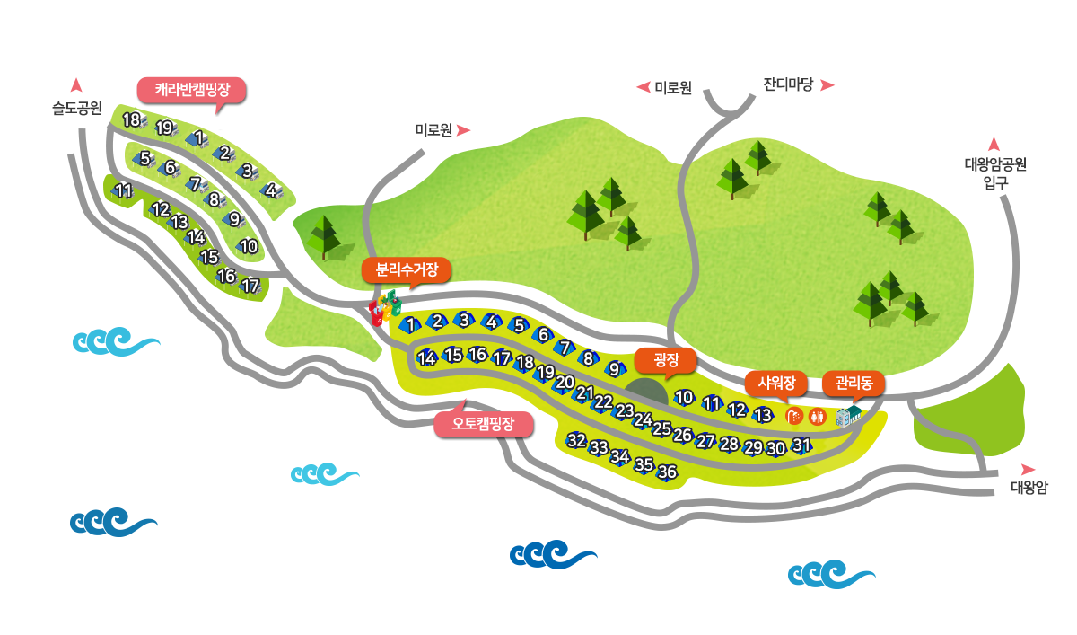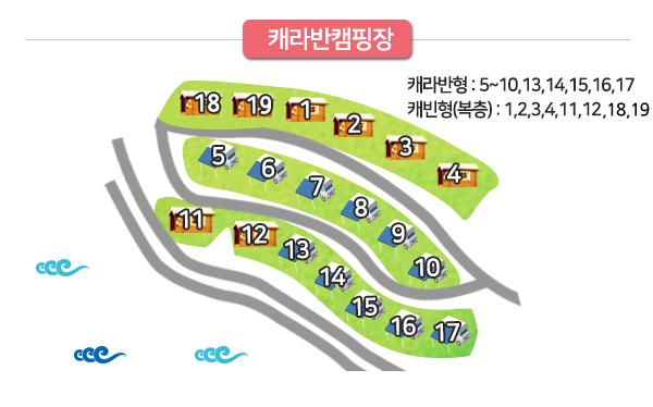 - 편의시설과 거리가 먼 명당 사이트(14~22번)는 조용하지만 화장실 등 접근성이 떨어질 수 있습니다.