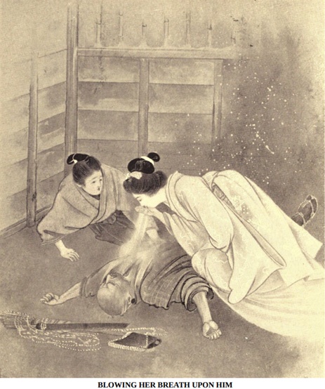 그런 다음 묘렌은 사무라이들에게 거울 사용법을 알려주었습니다. 그는 거울 주위에 촛불을 켜고 특정 단어를 암송하면서 거울의 표면을 응시하라고 지시했습니다. 사무라이가 시키는 대로 하자 거울에 비친 조상들의 모습이 보였고, 끔찍한 범죄를 저지른 한 조상도 포함되었습니다.