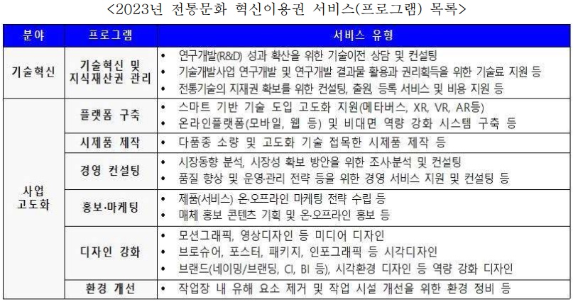 - 사업내용: 전통문화 기업에 필요한 분야별 전문 서비스 도입을 희망하는 기업에게 전통문화 혁신이용권(바우처) 지원 및 활용이 제공됩니다.
