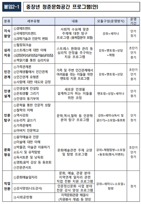 이를 위해 문체부와 고용부는 중장년 청춘문화공간을 마련하여 일상에 지친 중장년층이 문화와 고용서비스를 경험하며 자신과 주변을 돌아보는 기회를 제공하고자 합니다.