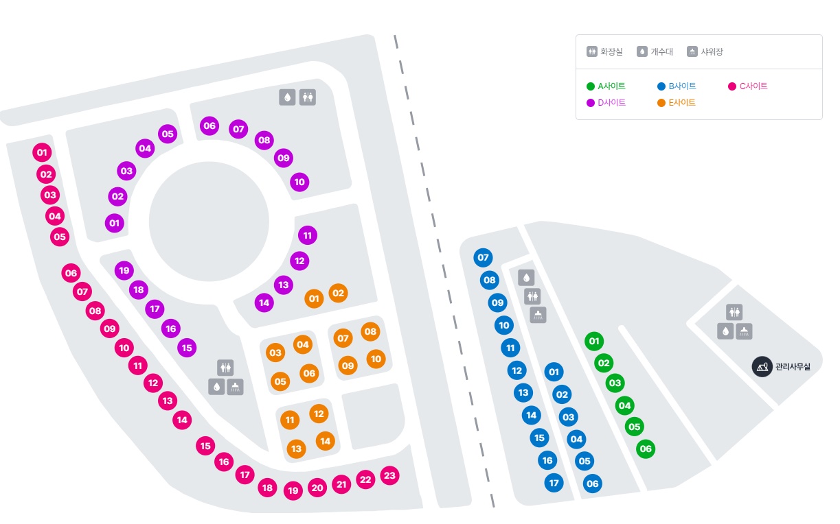 캠핑장 부지 : 50,000㎡캠핑 사이트 : 파쇄석 79면사이트 크기 : 8m × 10m화로대 : 개별시설 : 전기 사용 가능, 온수, 산책로입장 정보 : 개인 트레일러 입장 가능, 반려동물 가능 (목줄 필수)