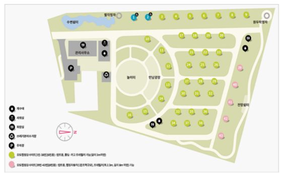 오토캠핑장 : 6인기준(A36면) 텐트, 텐트용 폴딩·카고 트레일러 가능(길이 3m미만) / 소형 카라반, 소형캠핑카 3M 미만 가능