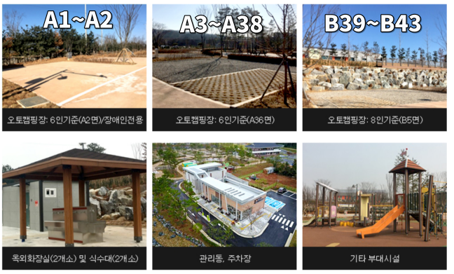 오토캠핑장 : 8인기준(B5면) 텐트, 텐트용 폴딩·카고 트레일러, 카라반 가능 (단, 트레일러는 폭이 2.3m, 길이 8m 미만에 한함.)